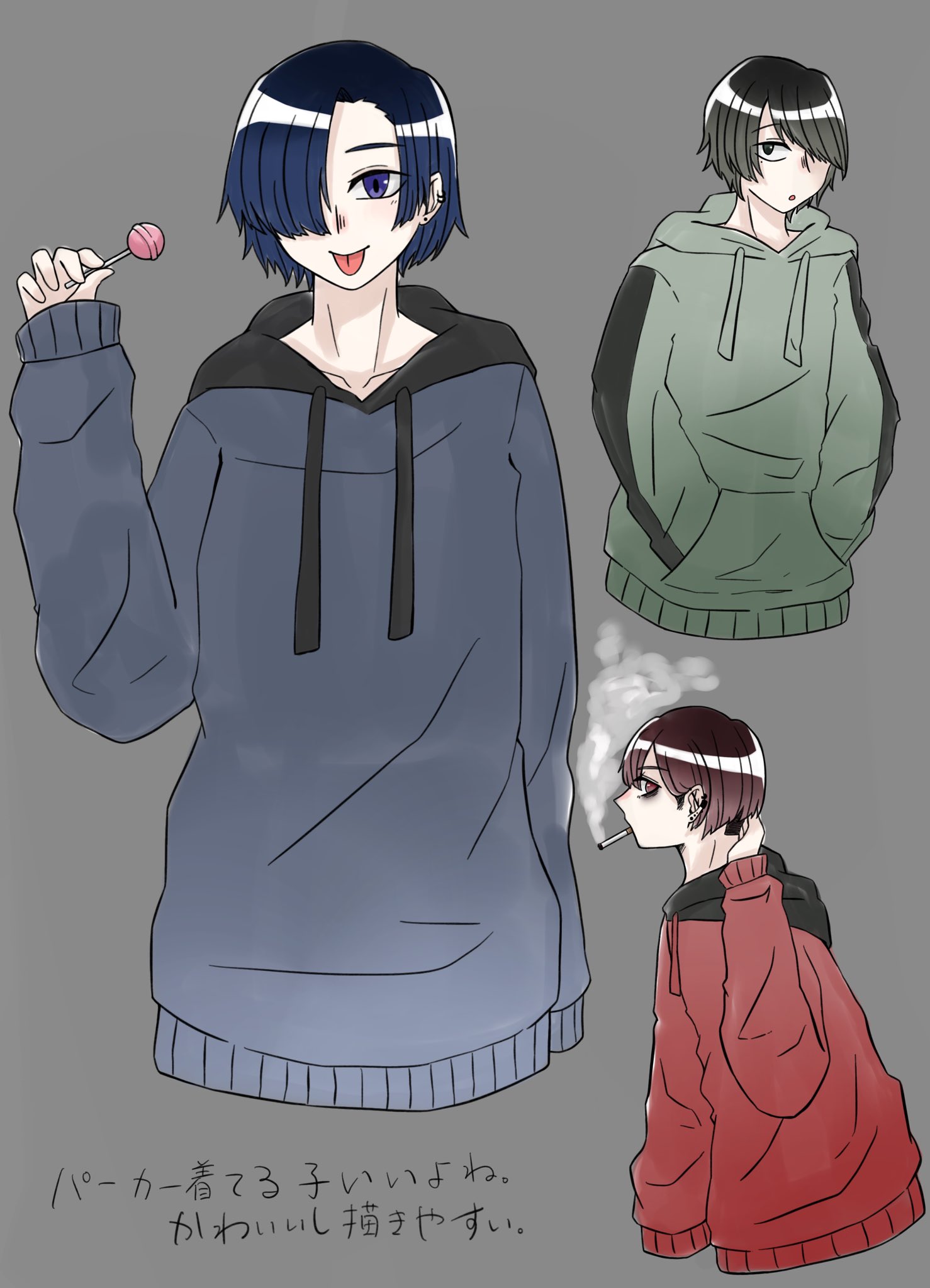 亜麻倉 蒼 低浮上気味 いつのまにか描いてましたw 俺の欲によってパーカーを着せられた子たちです フード部分とかに一部黒使うと可愛くなるって勝手に思ってますw あと 影と手端折りました すみません イラスト好きな人と繋がりたい イラスト練習中
